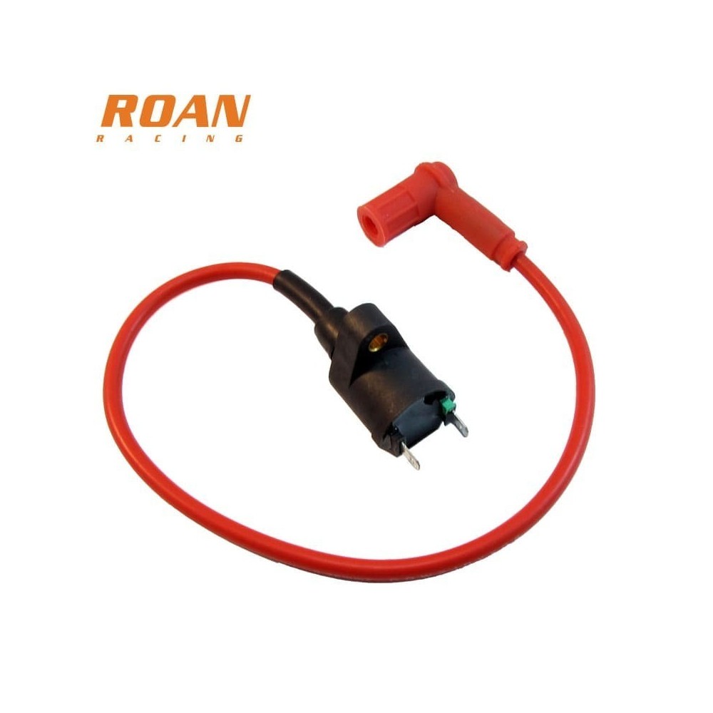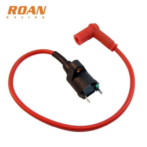 Bobina alta de competición para motores de 4 tiempos, la buena calidad de la bobina roan R3 genera una chispa más fuerte en la bujía, la pipa de bujía esta echa de silicona para una mayor resistencia a la temperatura, y para un ajuste a la medida deseada el cable viene con 45cm de largo.