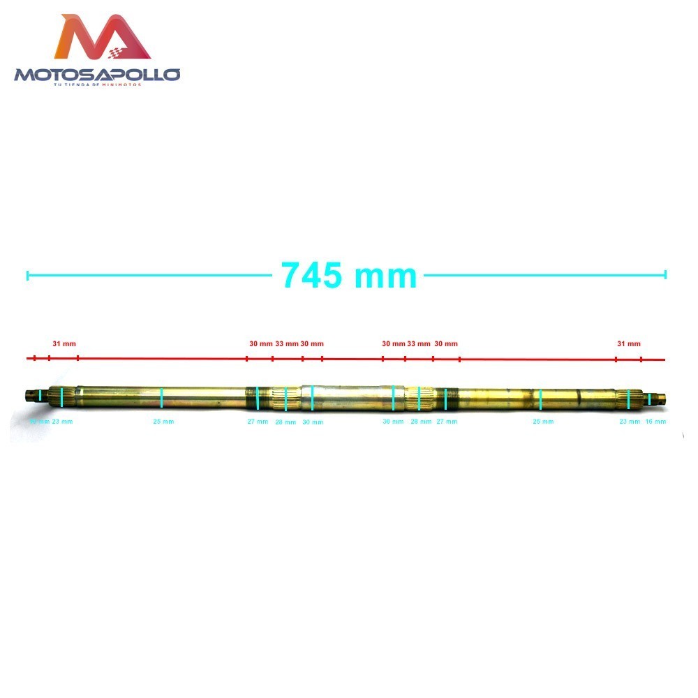 Eje trasero quad 4 tiempos 745 mm. Diámetro de rodamiento 30 mm . Valido para quad Pantera y/o Panda