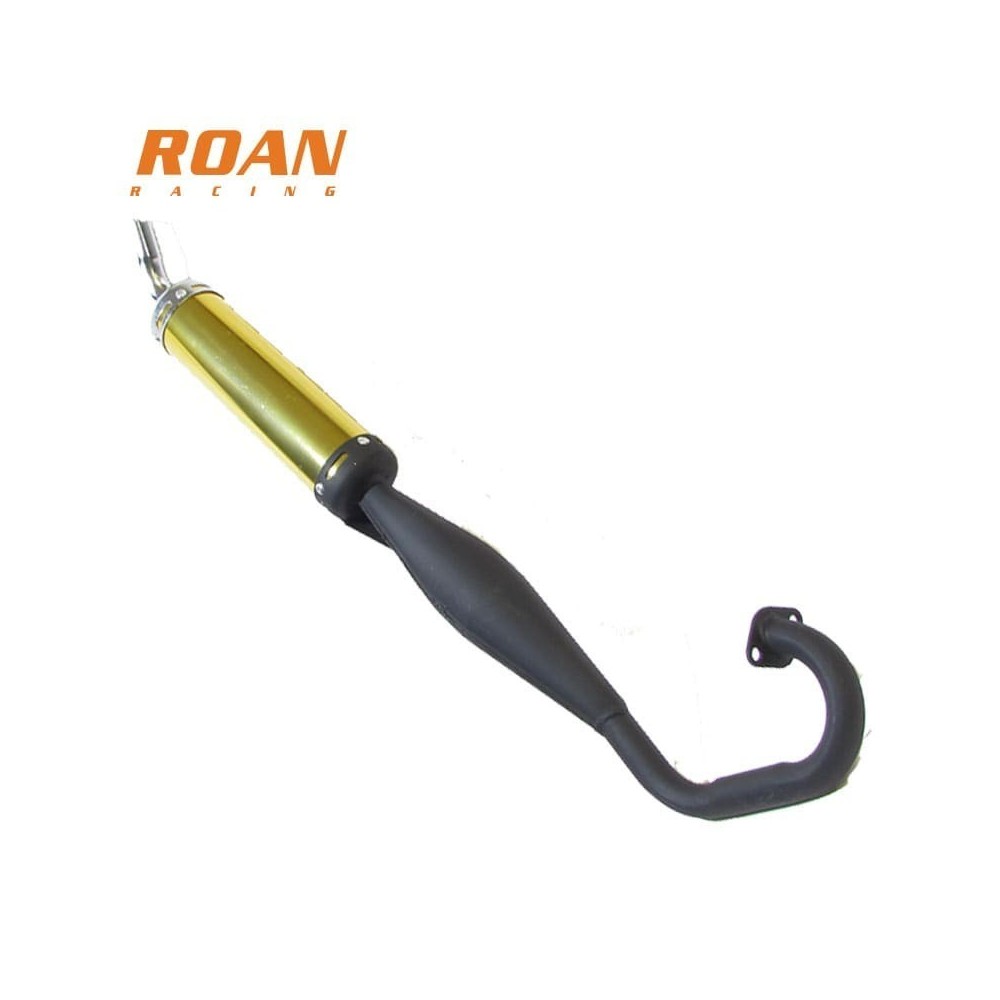 Tubo de escape Racing, para minimotos de 2 tiempos de competición. Con este escape añadirás más potencia a tu mini moto. Además de este escape, para aumentar la potencia de tu vehículo puedes cambiarle el carburador que trae de serie por uno de 15mm, un embrague reforzado de 2 muelles y una bujía especial para competición.
