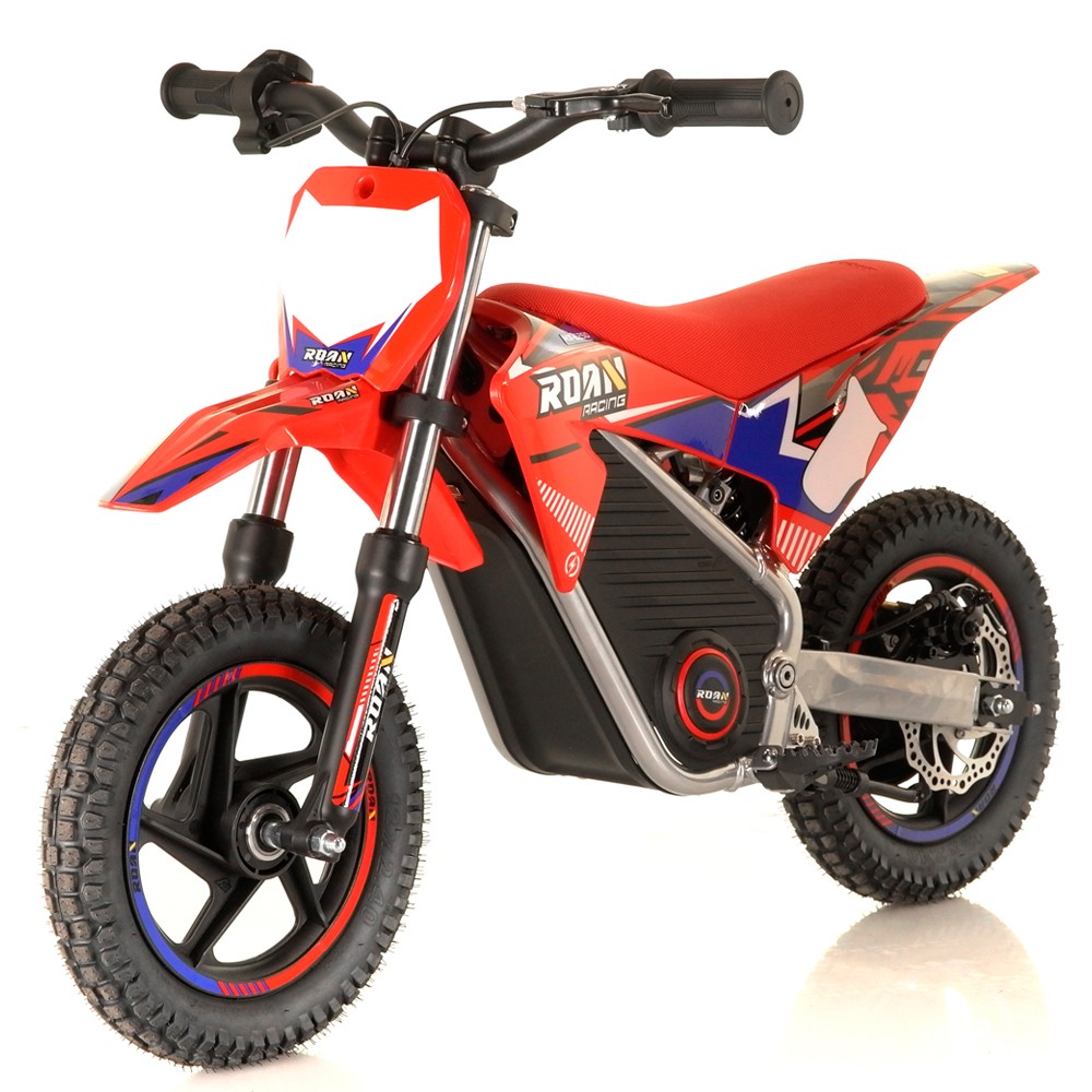 Minicross electrica 250W 12/12" Roan Warrior, autonomía hasta 18 km y una velocidad máxima de hasta 25km/h con limitador de velocidad en 12km/h y 8 km/h. Altura del suelo al asiento de 46 cm.