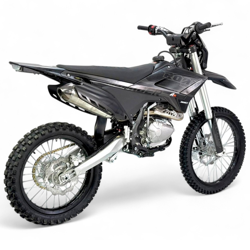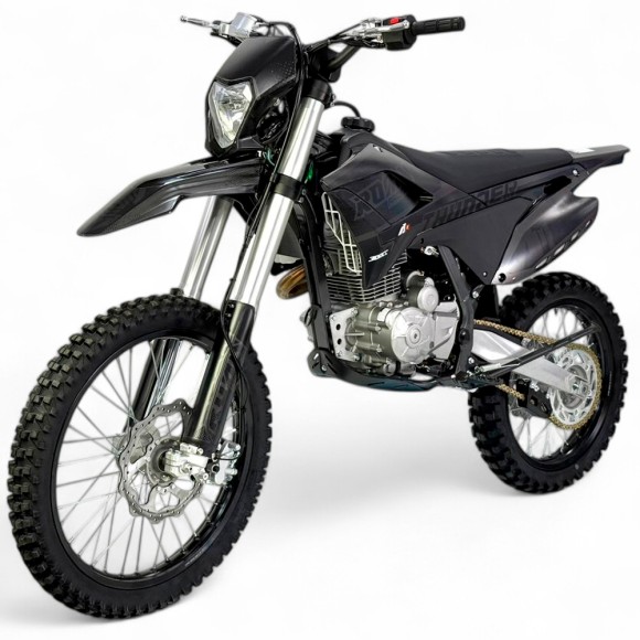 Pit bike 300cc 21/18" motor 4 tiempos arranque a pedal y eléctrico. Frenos y suspensión hidráulica. Altura de 91 cm del suelo al asiento. Faro e intermitente
