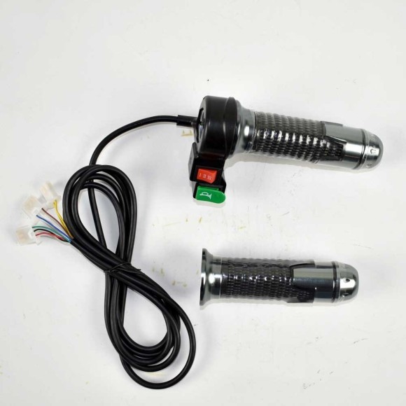 Este acelerador tipo puño se vende completo con su manguera de 8 pin, en el puño derecho lleva el limitador de velocidad a tres posiciones y el pulsador para la bocina/claxon, apto para patinetes eléctricos citycoco tipo chopper y Harley con batería de 60 voltios