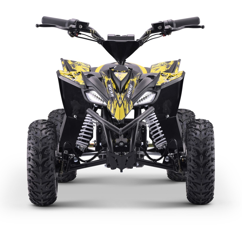 El diseño del Mini quad ROAN Eléctrico 1300W Ratte pone la seguridad en primer lugar. Equipado con frenos de disco hidráulicos en ambas ruedas, delanteras y traseras; ofrece una capacidad de frenado excepcionalmente segura y eficiente. El chasis reforzado proporciona una estructura robusta que soporta el uso intensivo y garantiza la protección de los pequeños conductores en todo momento.